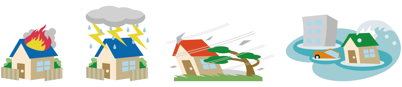 多くの火災保険では火災の補償だけではなく、落雷、風災、水災など自然災害のほか、水濡れ、爆発、盗難など屋内の事故も補償できます。ただし、地震が原因で発生した被害(火災や津波など)は地震保険でのみ補償されることが多いので注意が必要です。